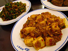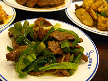 而嫩蔥肉末加上蝦米辣椒點綴的夠味蒼蠅頭,無論在哪絕對是讓人忍不住米飯一口接一口的下飯菜餚。滿是鮮翠青綠的苦瓜炒上鹹蛋,原以為口味應該厚重配飯,卻發現滋味卻跟視覺上相稱相配而是清淡爽口,反倒讓人嚐到苦瓜的清脆鮮甜。份量似乎點了多些的牛肉,配上同樣綠油的炒青椒,牛肉軟嫩與青椒的清脆混合出的是種契合互補的絕佳口感。