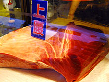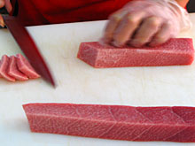 攤位上盡是標示著「大腹」、「中腹」等的高級部位,一般常見的紅肉「赤身」也許太過平常而反倒少見。挑了最高級的「三角」,據說,平均一條300公斤的鮪魚,大概只有20公斤左右的三角腹肉。三角腹肉的雪白油花充斥滿佈在鮮紅魚肉上,而交織透現出一種和諧瑰麗的粉紅光澤。也許是看多了日本的美食節目,對於鮪魚切片時的俐落動作總有種讓人興奮的莫名快感。當師傅舞動著犀利壽司刀,簡潔毫不牽連地將已切成飽滿長條狀的腹肉,進一步分解成一片片的鮮嫩生魚片,似乎只能盡量壓抑心中對於食物的殷切期盼。