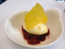 先上的是前菜點心。「鵝肝醬烤布丁(foie gras breadpudding)」是摻了鵝肝味綿密滑順;而「黑松露腸粉(black truffle cheung fan)」顛覆著既有對腸粉的印象;以湯匙盛裝並灑著小青蔥碎,入了口卻是沁涼冰淇淋與脆米混合著鹹臘味的竟是「臘味飯(lap mei fan)」。原來,萃取了臘肉、臘腸味至冰淇淋裡的分子料理手法,加上中西合併的料理,似乎正契合著主廚所主張的以港式點心出發、融合分子料理概念與獨特烹飪搭配,再以精緻的法式裝盤,進一步創造出異於一般的創意料理初衷。