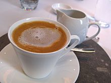 而主餐後的看來粒粒分明的蟹籽炒飯,初嚐是覺得有些生硬的口感,不過仔細嚼了幾口,卻發現米飯似乎就得如此軟硬度,才足以平衡上那些脆彈十足的小蟹卵。最後,遞上了咖啡、倒上打了泡的熱奶水,搭配上小巧冰淇淋,開始在飽食之餘淺嚐些悠閒自在。