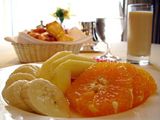號稱「有機」的歐陸早餐,接續而上的麵包、水果盤、麥片、優格(Yogurt)、漬鳳梨、漬梨子、豆漿與咖啡。似乎同樣屬於歐陸人份量的巨量早餐,只能慢慢用、只能緩緩來,只能在那種吃了又停、停了再吃的緩調慢步裡,將那些足以飽食一整天的豐盛食物慢慢去化。