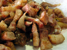 蘭嶼村落裡的小路邊,有著常見的原住民烤肉。偶然嚐了一小口,卻發現了烤肉的好滋味。小攤子不像是常見的原住民石板烤肉,而只用粗陋的烤肉網上擺著一塊塊的香腸、豬肉,剪上小小塊,再撒上些用以調味的胡椒鹽。簡單粗糙的調理,卻有著食物最單純的美味。
