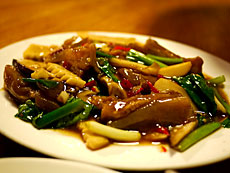 略過了那些滷味小菜,也同時略過了小菜櫥櫃上瓶瓶玉立的盈滿不一的晶透金門高樑酒瓶。似乎,這種店裡就該入味小菜搭配嗆辣烈酒、就該豪邁的回憶起過去戍守前線戰地小島相互拼酒時的氣魄瀟灑。只是,缺了慫恿相迫的傻勁酒伴,換上了依舊台味洋溢的沁涼啤酒,搭配上店家隨機順手端出看來簡單卻是實在夠味的幾樣菜餚,卻也是另一種暢快恣意。