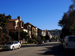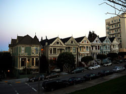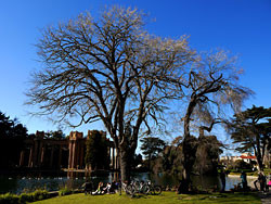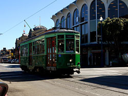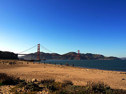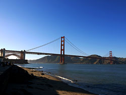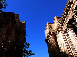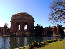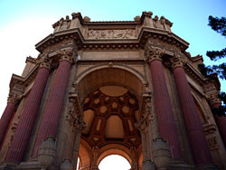 靠向海邊的綿延建築各有特色,有維多利亞式房屋(Victorian House),也有那種永遠帶著耀眼陽光的拉丁式建築。沿著建築、向著陽光步往藝術宮(Palace of Fine Arts),一邊是攝人氣勢卻顯優雅的仿古羅馬圓頂建築,另一邊是水池畔拍攝婚紗的燦爛笑臉,大概,溫暖耀量的加州陽光裡見不著絲毫的灰矇陰霾。而雋麗豔紅的金門大橋(The Golden Gate)則是舊金山的鮮明地標,順著海岸線緩緩靠近,試圖不遺漏任何一個可能捕捉的鏡頭,或許,金門大橋早已出現在不計其數的電影圖片裡,但親臨其間,才發現即便是不經意輕觸橋面的簡單,都遠勝看過千萬張圖片的精彩。