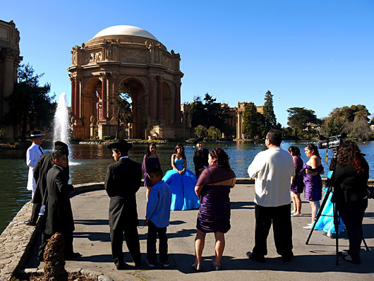 舊金山藝術宮(Palace of Fine Arts)的美麗建築,理所當然成為吸引許多人婚紗取景的好地方。大概,西方人拍婚紗總喜歡攜家帶眷大張旗鼓才有趣。