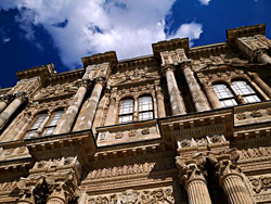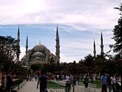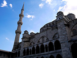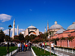 多瑪巴切皇宮(Dolmabahçe Sarayi)是托普卡匹皇宮使用四百多年而老舊不敷使用後,耗時13年才完成的建築。鉅耗鄂圖曼帝國末期困頓財力的新皇宮,據說連第一任遷入的蘇丹阿布朵麥奇(Abdülmecid)本身都認為建築裝飾實在過於氣派華麗。走進大宴會廳,精雕金碧飾滿華貴圖案的高挑廳堂,中央掛著4.5噸重的磅礡水晶吊燈,是記憶裡未曾見過令人屏息咋舌的攝人氣勢,以皇宮比擬國力的外交軍備競賽,鄂圖曼帝國絕對更勝一籌。只是,皇宮裡耗盡國家財力而大於國力的華麗,後世看來卻是種崩壞瓦解前夕的短暫曇花悲涼。 矗立舉世無雙六支叫拜塔的藍色清真寺(Sultanahmet Cami)裡,開闊空間抬頭仰望高挑圓頂,各種圖案交織的多彩綴飾,使得伊斯蘭的信仰中心更顯典雅而莊敬。一盞盞高掛垂下的黑色圓框綴著點點金澄微光,透過一扇扇天頂小窗灑入的陽光,彷彿,慕斯林虔誠的祈拜在此與真主阿拉的距離更加接近。至於始建於查士丁尼大帝(Justinian the Great)拜占庭時期彰顯基督教榮耀,卻為鄂圖曼蘇丹穆罕默德二世(Mehmet II)改建成清真寺的聖索菲亞教堂(Ayasofya),後世對於原有教堂內部的部分復原,希臘東正教教義鑲嵌與伊斯蘭藻飾書法並列其中,卻未發現相異教派間的突兀相斥,反而是種和諧的包容兼蓄。